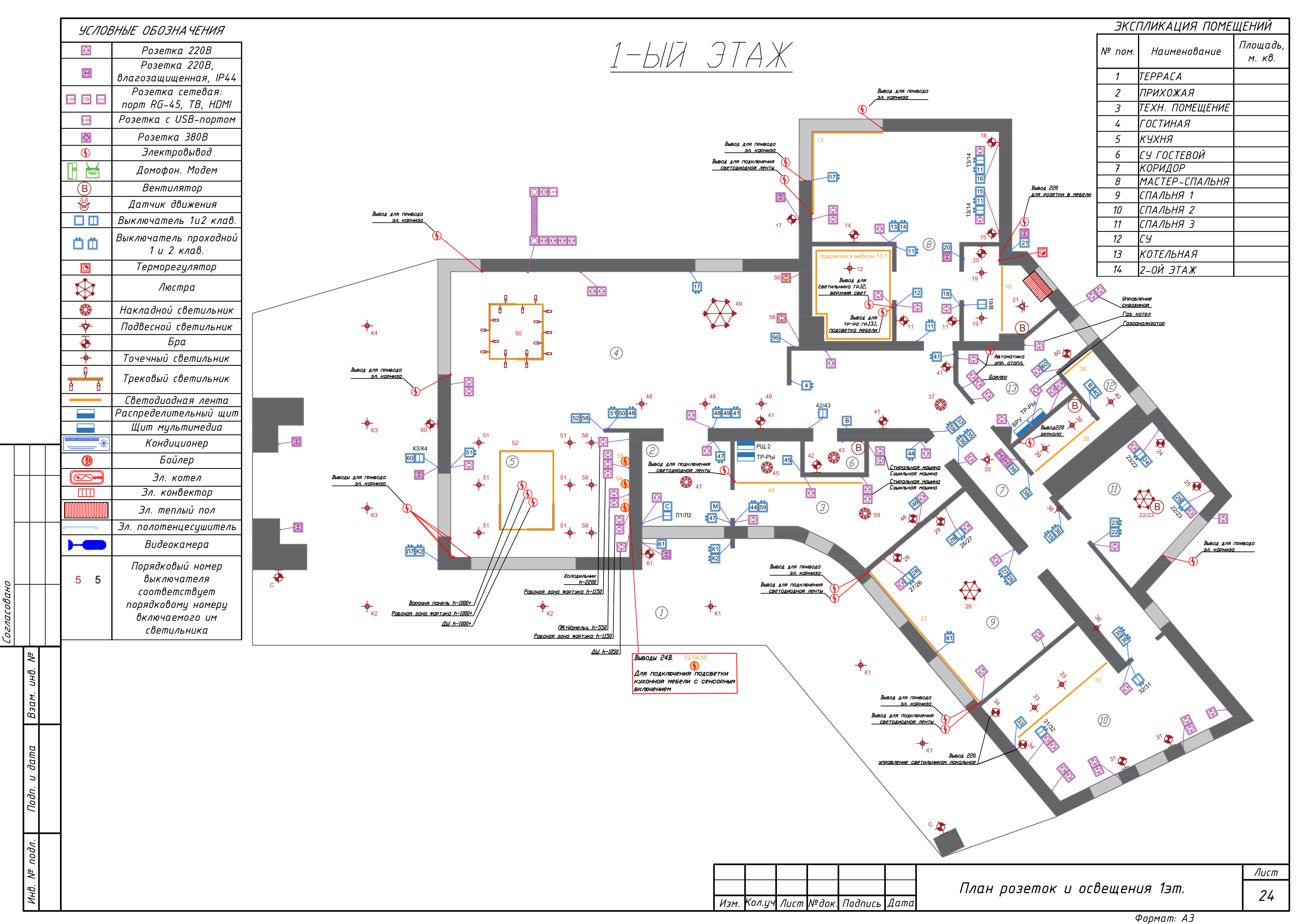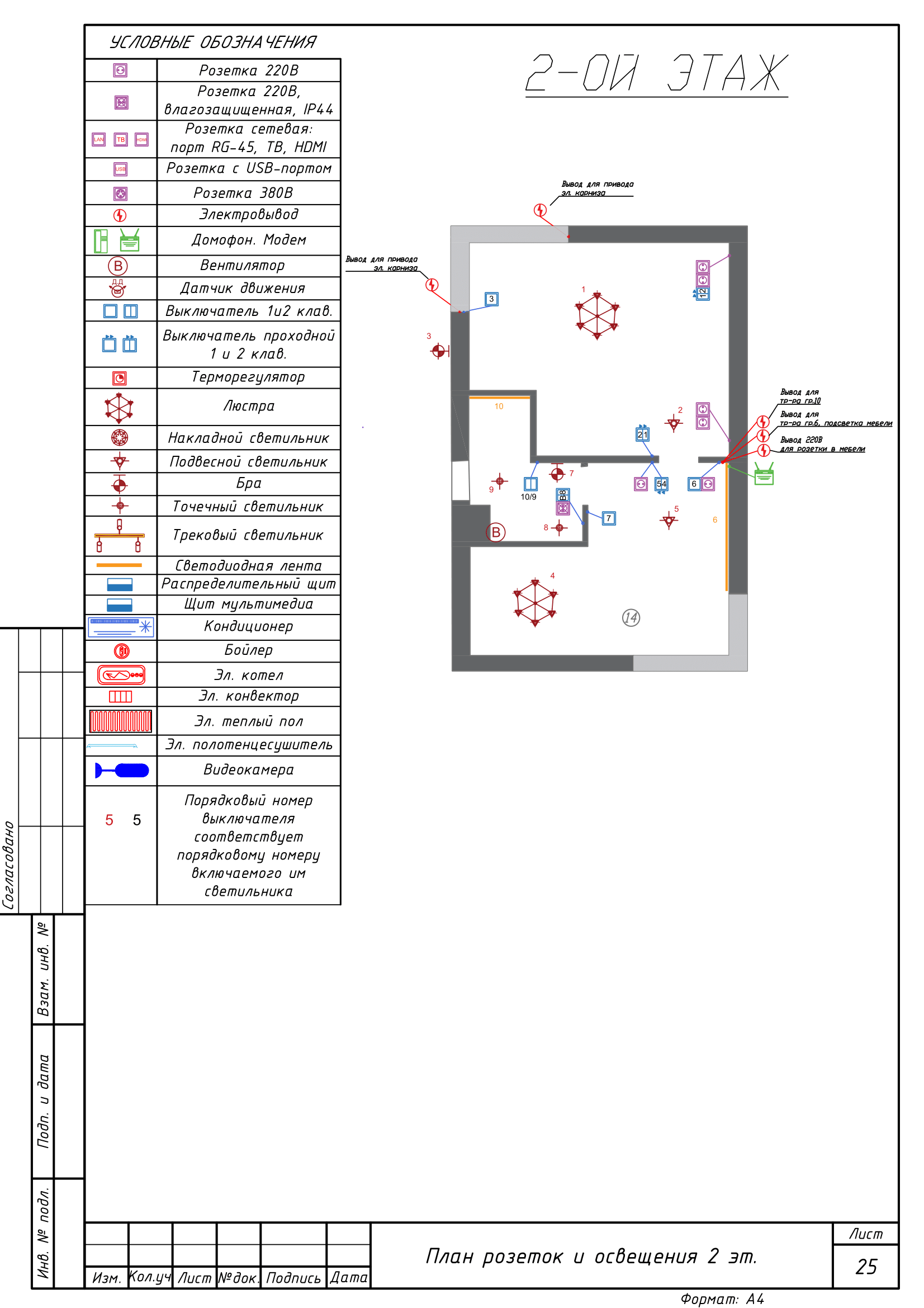 - Шаг 3 — Выезд на объект, анализ и сбор данных. Проговариваем схему электроснабжения — размещение розеток, освещения, оборудования и тп. с учетом Ваших пожеланий. Либо берем за основу раздел электрики дизайн-проекта. Заключаем Договор на проектные работы.