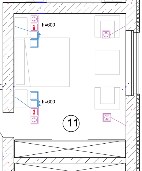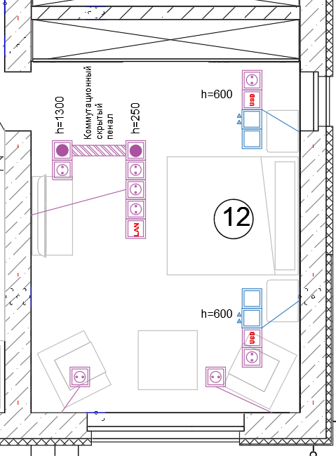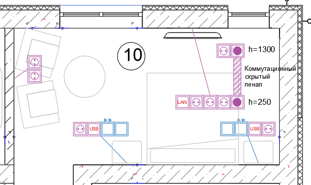 В эти прикроватные блоки добавим по одной розетке 220В и с разъемом USB. Также предусмотрим розетки для ТВ-зоны и пару вспомогательных в нужном месте в помещении.