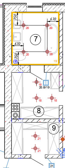 В соответствии с их указаниями размещаем на плане розетки в нужном количестве и добавляем описание по принадлежности. Для освещения я применю точечные светильники. Не забываем, по ходу нанесения на план, определять принадлежность к группе включения освещения. Напомню — присваиваем одинаковый номер выключателю и светильнику, чтобы было понятно какой выключатель каким светильником управляет .