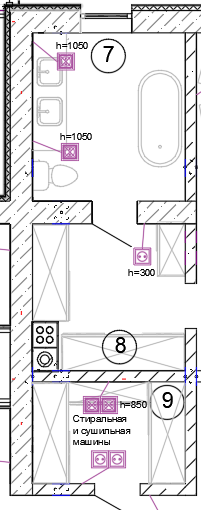 В Душевой, в районе зеркала разместим розетку со степенью защиты IP65, для фена. Если фен предусмотрен стационарный, то вместо розетки обеспечим вывод кабеля с запасом длины, для его последующего прямого подключения.