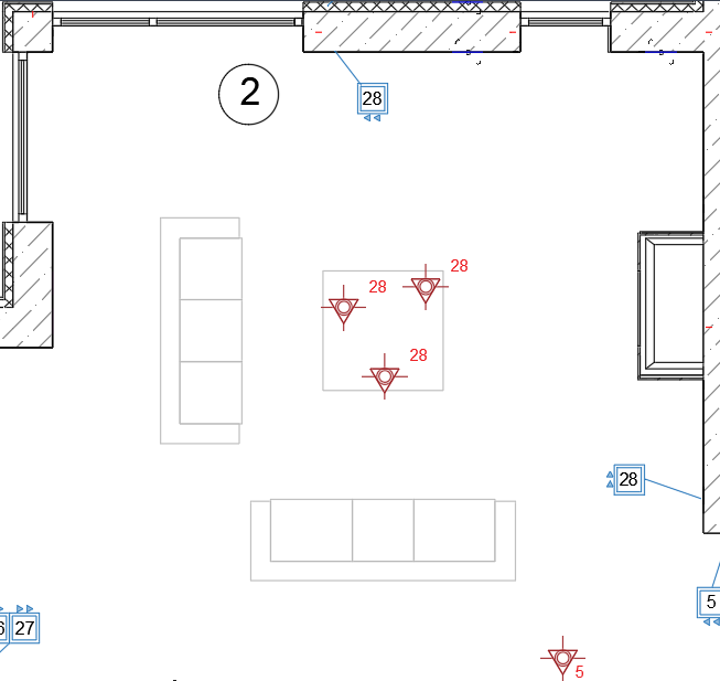 На плане освещения мы будем распределять свет на группы включения. Будем по порядку присваивать одинаковый номер выключателю и светильнику, чтобы было понятно какой выключатель каким светильником управляет .