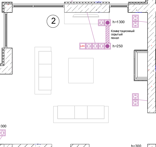 Розеточная группа будет состоять из вспомогательных по сторонам от камина и блока розеток для ТВ-зоны.